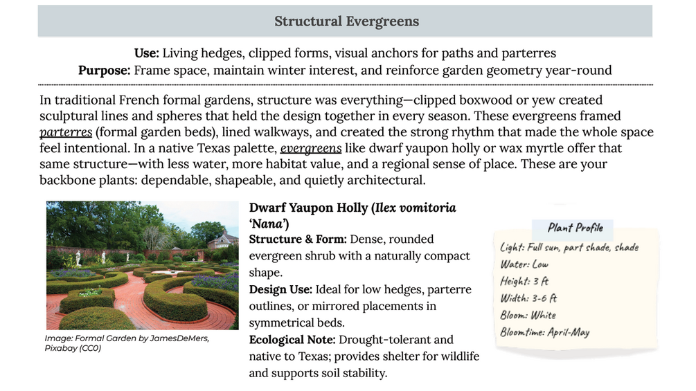Inspired by the timeless symmetry of French formal gardens and reimagined with native plants that thrive in Texas and the Southern U.S., this lookbook helps you create a landscape that’s both visually stunning and climate-conscious.